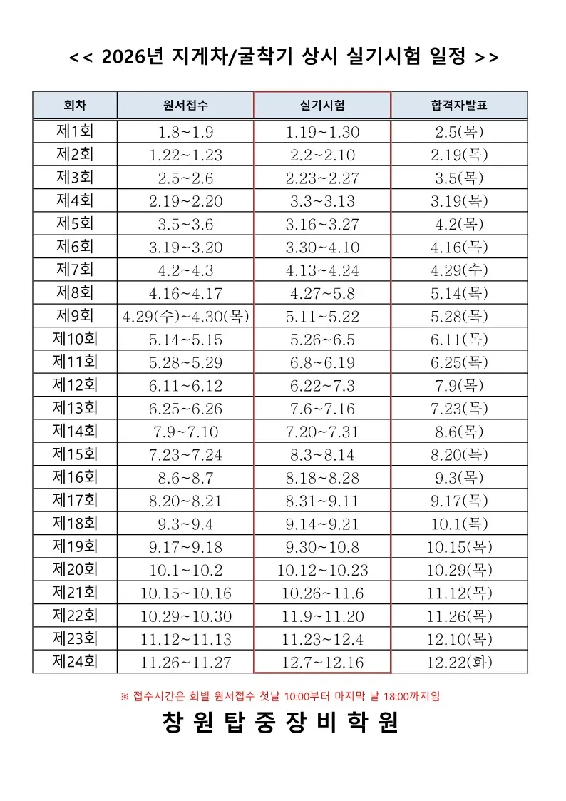 2026년도 지게차 굴착기 운전기능사 상시시험 일정표(실기)